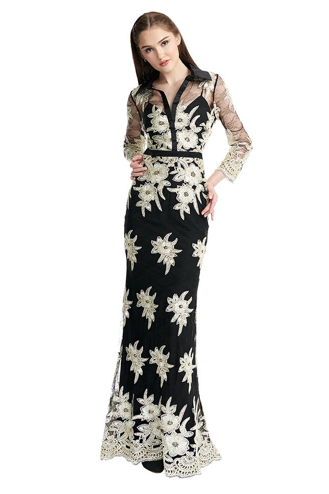 BAGDLEY MISCHKA talla 6 negro y oro manga larga corte recto decoración en guipur dorado