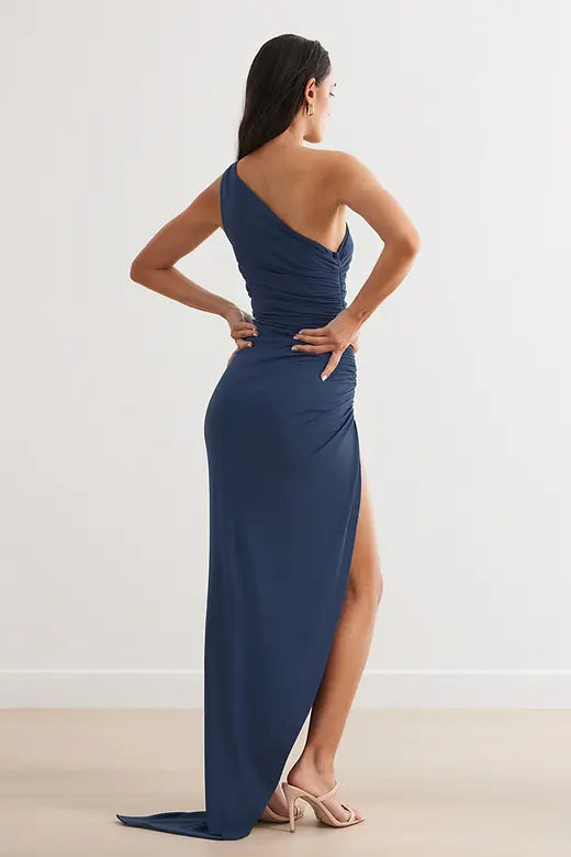 El Vestido Carina está confeccionado en un punto elástico y presenta un escote asimétrico, una silueta ajustada y un favorecedor fruncido en las costuras laterales. Se cierra en la costura lateral con una cremallera invisible y tiene una abertura hasta el muslo en un lado.