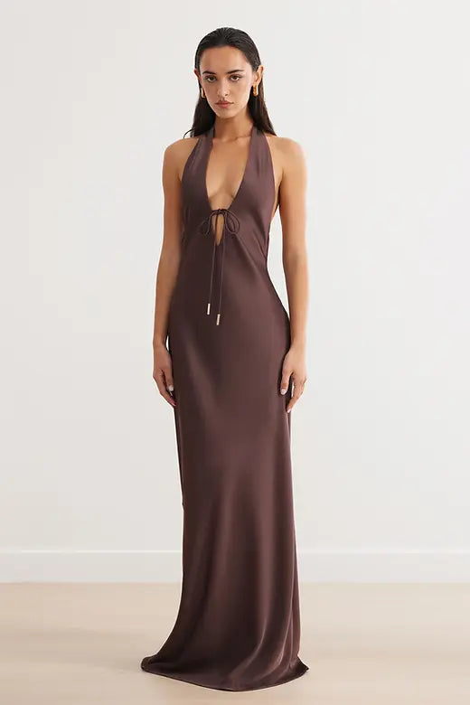 El Vestido Diaz presenta un sexy escote halter combinado con un delicado lazo para atar. La falda drapeada roza el cuerpo y cae desde las caderas con mucha elegancia. La espalda expuesta presenta una capucha bellamente drapeada y tirantes para atar.