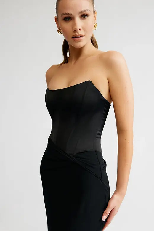 El Vestido Elora es lo último en vestido elegante y glamoroso para cualquier evento especial. El vestido presenta un corpiño de satén deshuesado con un elegante escote ligeramente redondo. La falda está confeccionada con un tejido georgette en contraste que cae maravillosamente sobre el cuerpo. La falda presenta un detalle retorcido en la cadera izquierda y en la espalda.