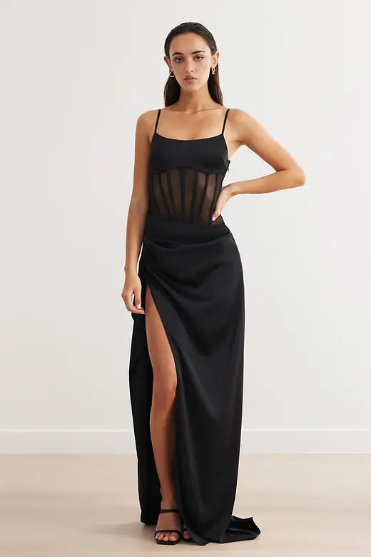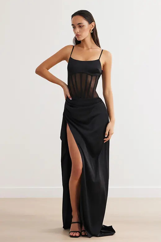 El Vestido Estelle es lo último en vestido elegante y glamuroso para un evento especial. El vestido presenta un corsé de malla deshuesada con corpiño y falda de satén en contraste. La falda cae maravillosamente alrededor del cuerpo y muestra una abertura hasta el muslo con detalles de pliegues y pliegues en cascada.