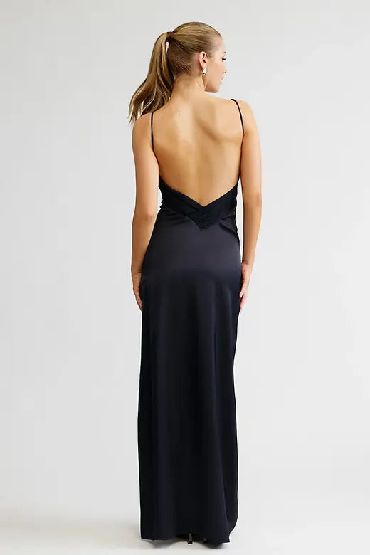 Vestido de satén hasta el suelo con paneles traseros de georgette en contraste Fruncido favorecedor en la cintura y en las costuras laterales División a la altura del muslo en la pierna izquierda Tirantes finos ajustables Espalda baja con diseño en forma de V. Totalmente forrado Cremallera invisible en la costura lateral izquierda
