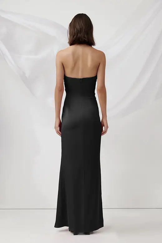 El Vestido Magnolia está confeccionado en satén reciclado pesado y lujoso. Con su silueta simple pero elegante, esta pieza presenta un escote bellamente fruncido con un diseño de busto redondeado. Es largo y se cierra con cremallera invisible.