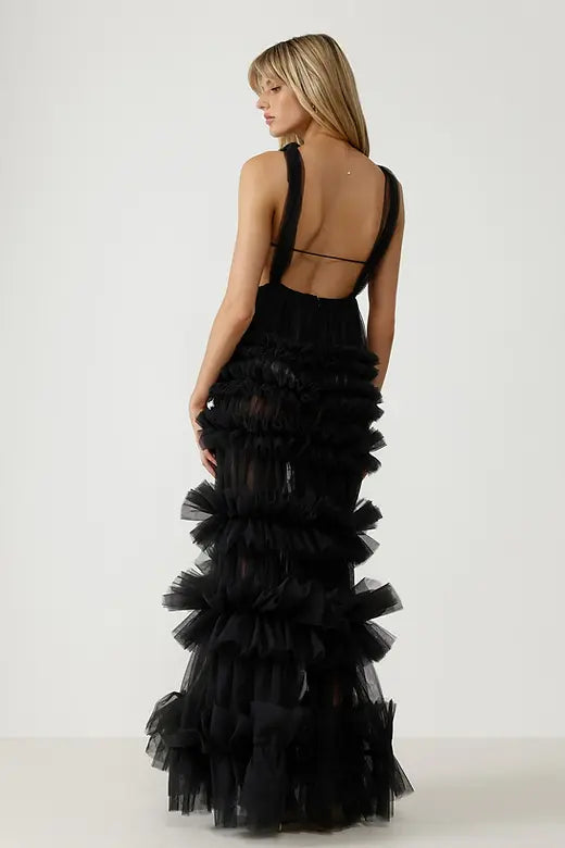 ¡El Vestido Mariella es el look definitivo! Con suaves capas de tul e hileras de volantes fruncidos, este vestido seguramente sorprenderá a la multitud. El diseño del corpiño presenta un detalle de tira asimétrica con lazo y un escote profundo. La espalda abierta presenta dos tirantes anchos y una correa horizontal elástica para sujetar el busto.