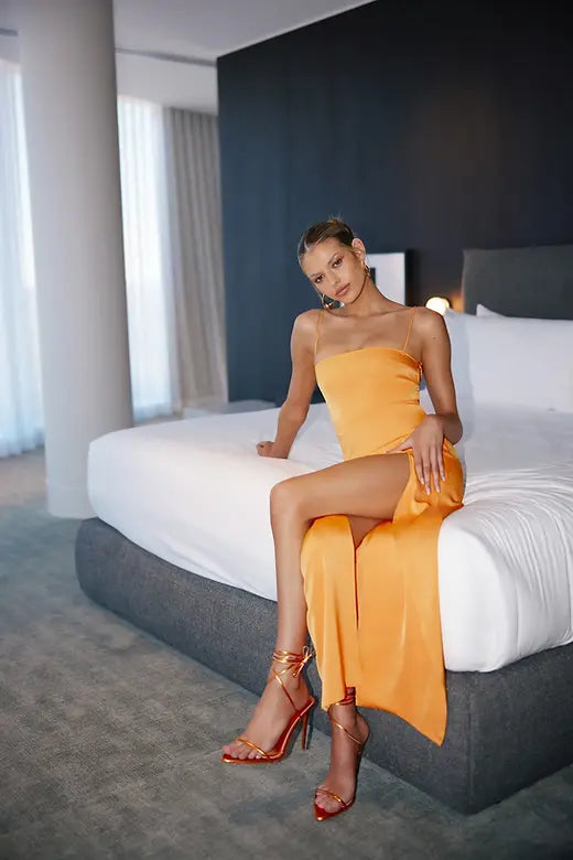 El Vestido Orlando presenta un escote recto con tirantes finos y un diseño con cordones en la espalda y escote redondo. Se cierra en el centro de la espalda con una cremallera invisible y presenta una abertura hasta el muslo.
