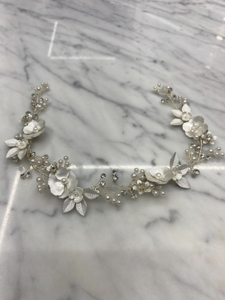 EL TALLER tocado en guia plateada perlas cristal flores ,hojas