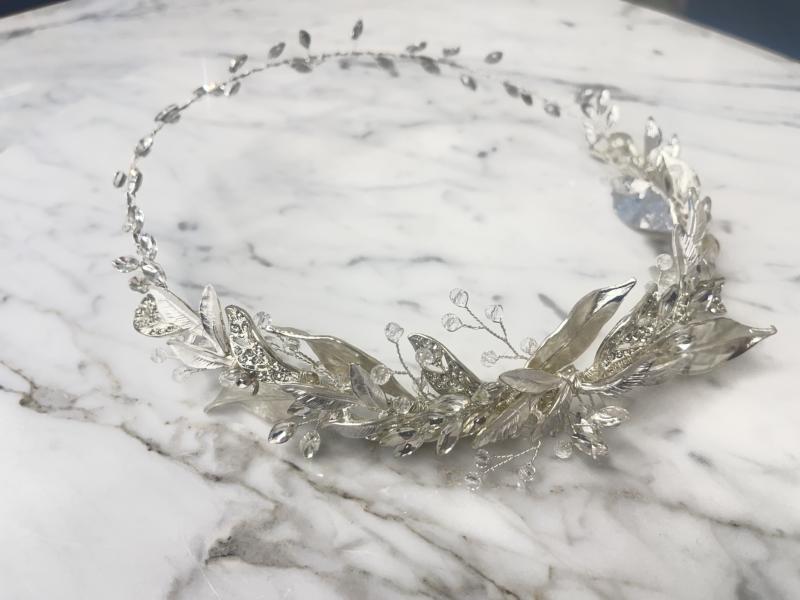Corona ligera y flexible en tonos plata, llena de destellos y detalles florales que iluminan el look de la novia