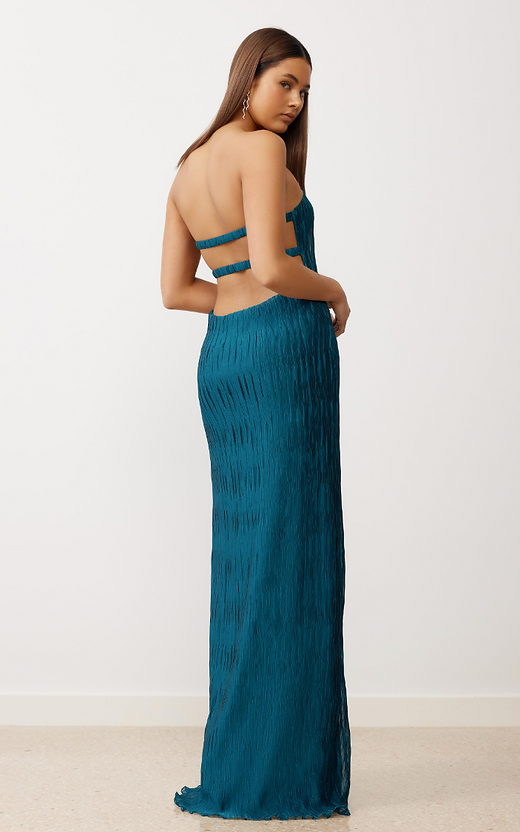 El Vestido Ula es un vestido elegante hasta el suelo, con escote palabra de honor y silueta de columna sencilla. La espalda presenta bandas elásticas paralelas y una cintura baja sexy. Confeccionado con un delicado georgette plisado, este vestido es el look perfecto y sencillo.
