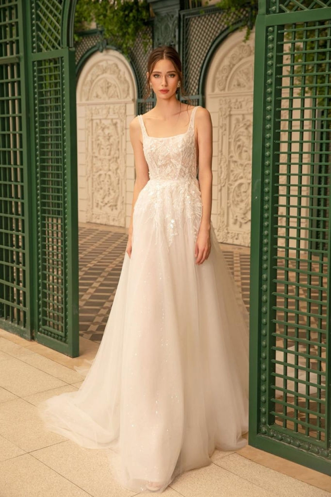 DANY TABET talla 0 ivory escote cuadrado tirantes finos y falda vaporosa con detalles de encaje y brillo