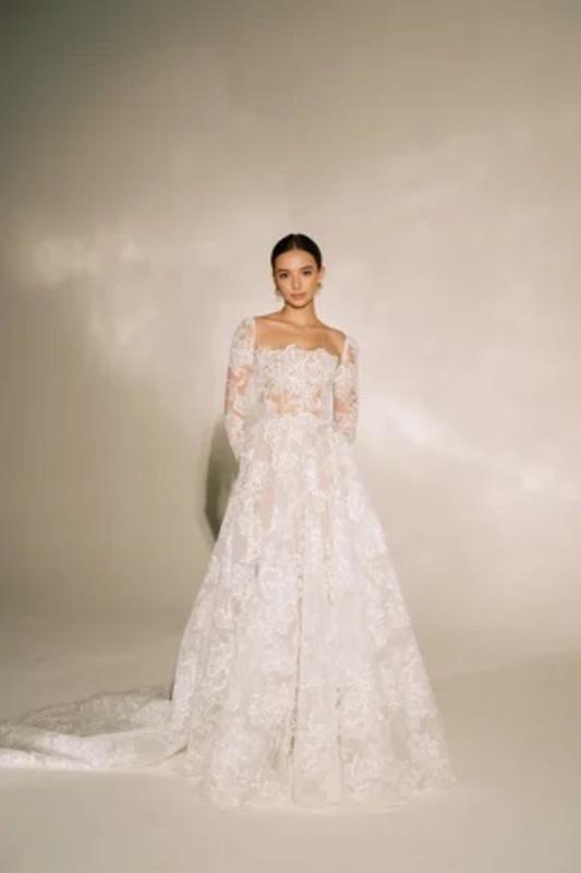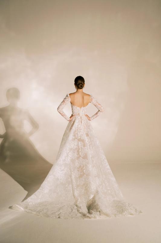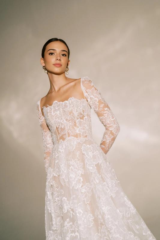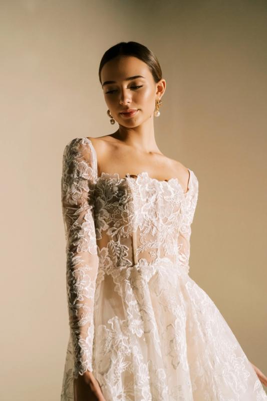 Experience a blushing dream. With its modern princess skirt and structured top, all elegantly lined in soft blush.